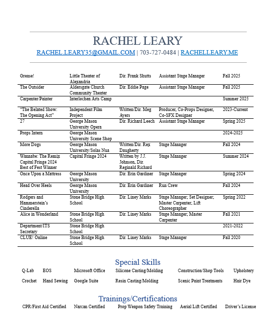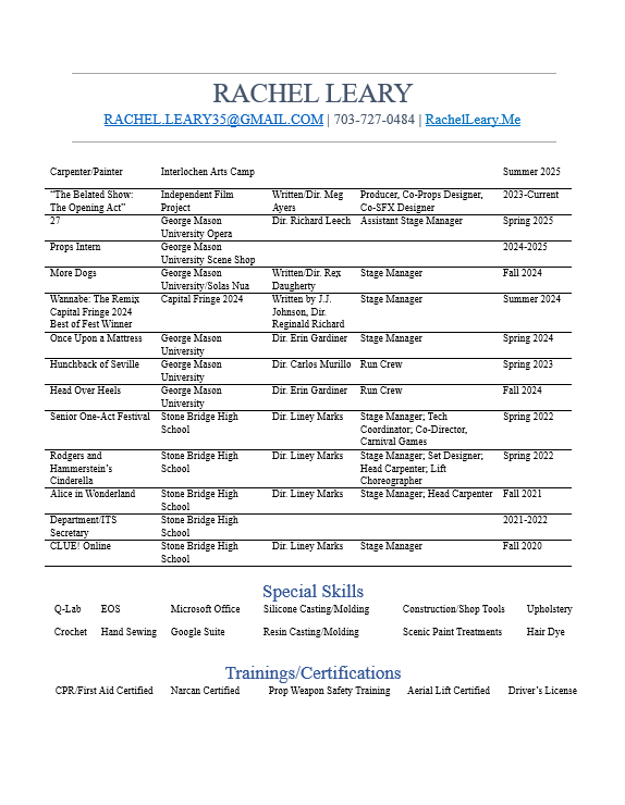 I am a theater technician, designer, and stage manager in the DC area. After growing up figure skating competitively with Capital Theater on Ice and Team Ashburn Synchronized Skating, I started doing theater tech in high school as hair and makeup crew and run crew, then branched out into construction, set design, and eventually stage management. I’ve stage managed two full productions at George Mason University, and I stage managed 2024 Capital Fringe Best of Fest winner Wannabe: the Remix by J.J Johnson. I have worked in the GMU Scene Shop as one of the Props Interns, and I served as the Assistant Stage Manager for GMU School of Music’s Opera, 27. I recently finished my first summer working as a carpenter and painter at Interlochen Arts Camp in Michigan. I have experience in virtually every area of theater, but Stage Management, Set Design, and Props have stuck with me the most. I’ve also recently branched out into the film world, working as a Producer and Co-Props Designer on a feature-length film called The Belated Show: The Opening Act.